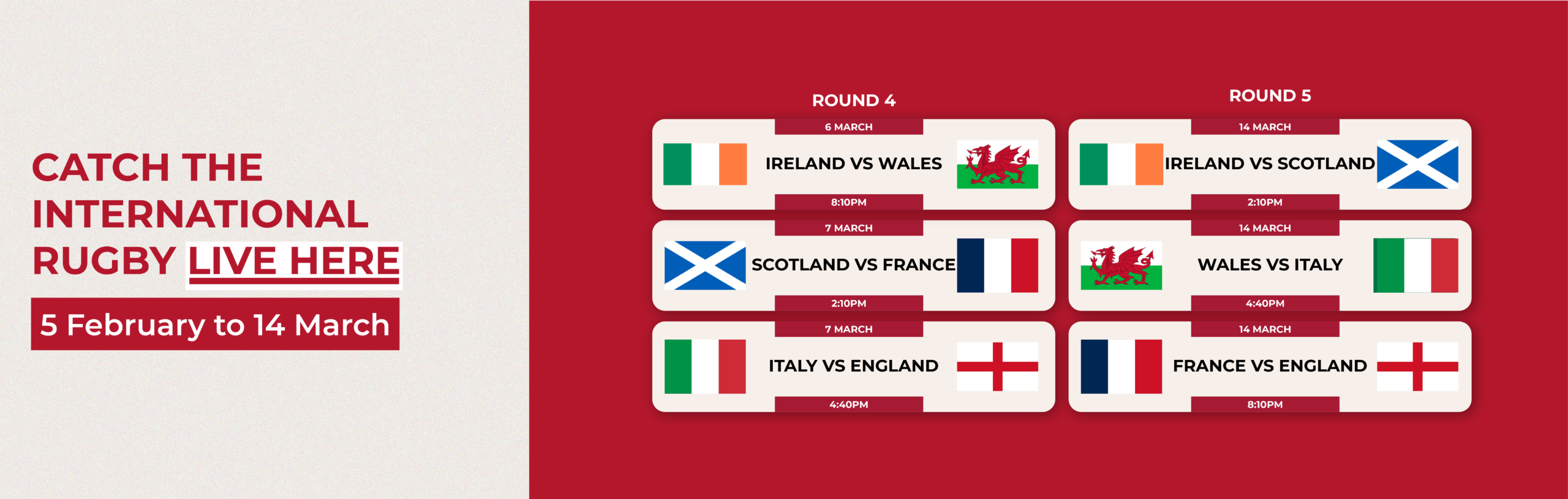 Coverage of Round 4 of the Six Nations from the Aviva Stadium in Dublin. The two sides renew one of the Championship’s oldest rivalries, having met 136 times since 1882 with Wales holding a slight historical edge overall, though recent meetings have favoured Ireland. In their last Six Nations clash, Ireland took a 27-18 win in Cardiff to secure the Triple Crown, and they also posted a 31-7 victory in Dublin the year before — part of a run that has seen Ireland win four of the last five battles between the nations.